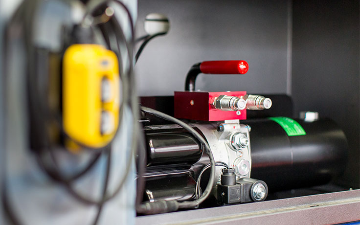 - Power unit features a built-in hydraulic flow divider for precise equalized lifting