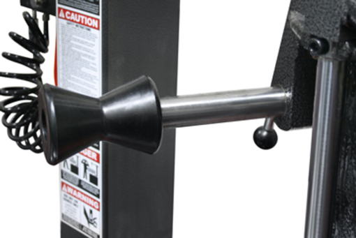 Right-side assist tower features a multi-profile traveling drop-center tool that holds stubborn sidewalls in the drop-center area of the wheel for swift, precise mounting. A single lower-bead lifting disc can be used to unseat stubborn lower beads or to elevate tires for tool placement. A power-drop top bead assist roller helps hold difficult top beads in place during removal and in installation of tough sidewall tires. These important tire shop tools dramatically reduce the effort required to change difficult, low-profile tires and help minimize operator fatigue. Upfront trigger control and articulating arm allow for variable tire and wheel configurations. A heavy-duty, tri-flange, cast-iron assist tower carriage features linear way bearings for maintenance-free operation.